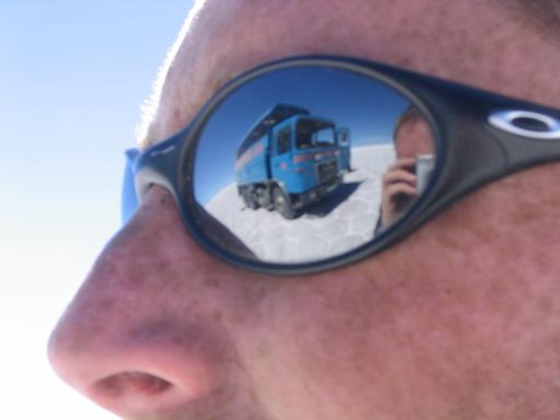 The truck reflected in Chris's sunglasses.